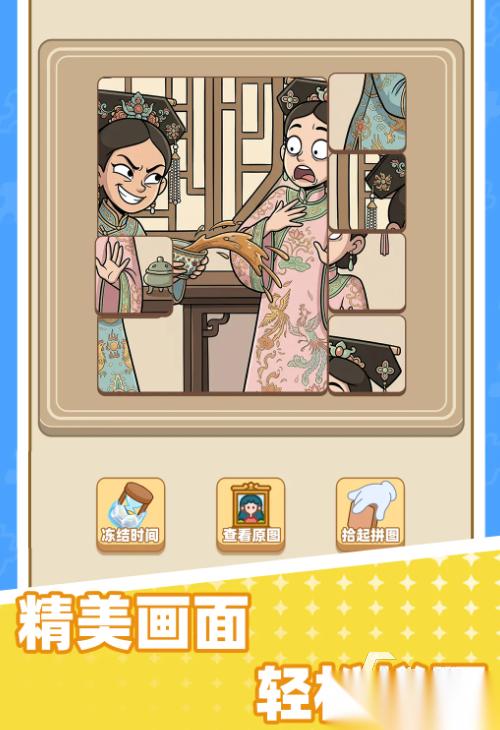 虽然是拼图小游戏,但游戏的画面还是比较精美的,各个人物细节描绘都非常精致,衣裳的花纹,色彩,都运用的极好,让小伙伴们不仅可以玩的开心,视觉效果也是舒服到极致了。