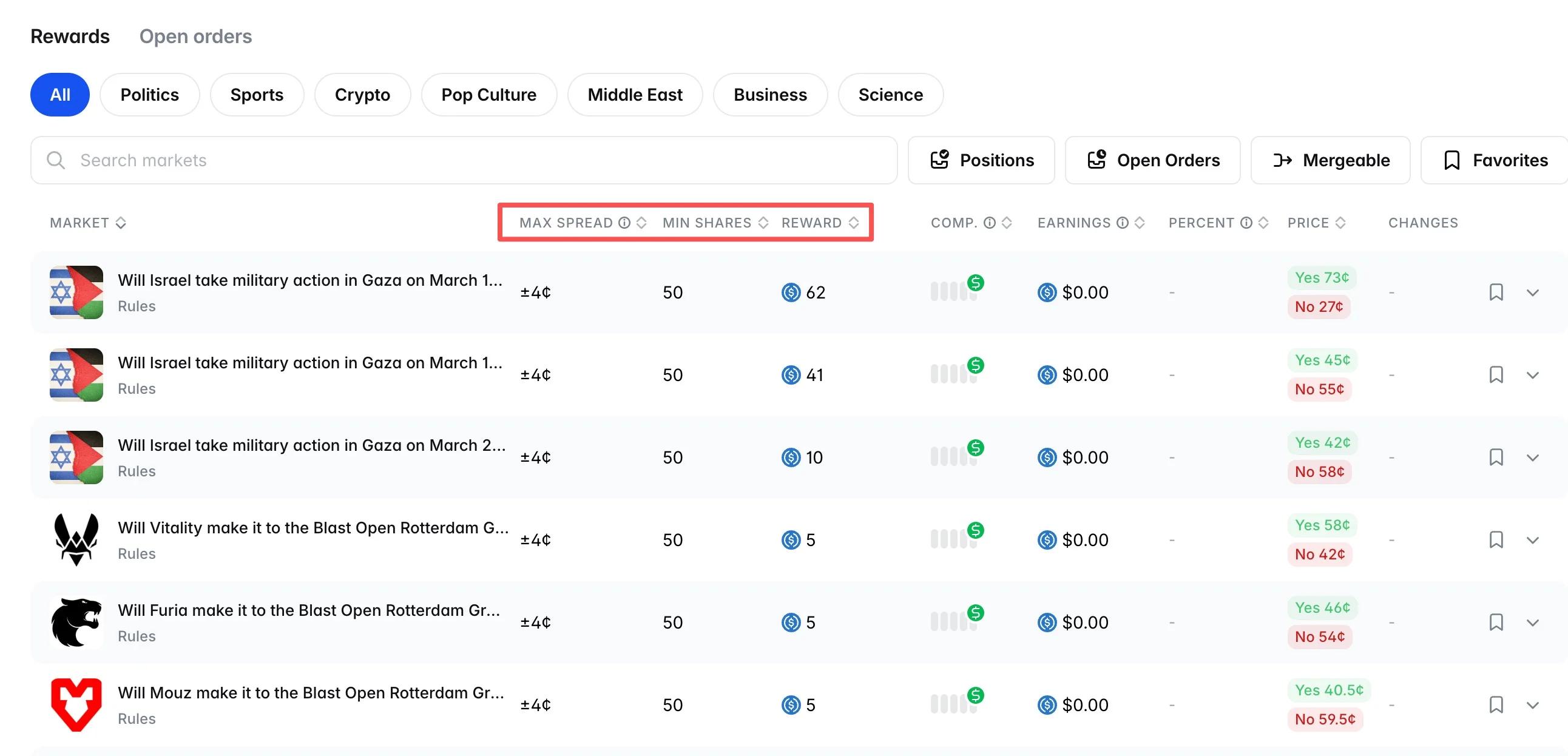 首先打开 Polymarket 的 Rewards 页面,点击后 Reward 后即可按补贴力度对所有事件进行排序。不难看出,目前 Polymarket 上补贴力度最大的事件均为 NCAA “疯狂三月”的比赛。(我自己过去几个月都在 Polymarket 上组流动性,也从未见过如此级别的补贴力度。)