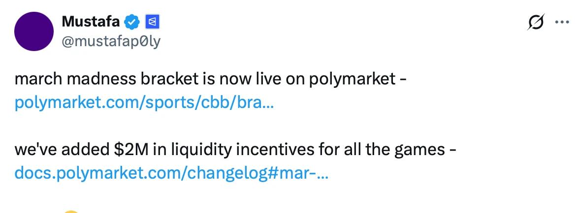 但当下,Polymarket 却提供了一个绝佳的机会窗口 —— 随着 NCAA “疯狂三月”的来临,Polymarket 已宣布将对相关赛事提供 200 万美元的 LP 补贴。