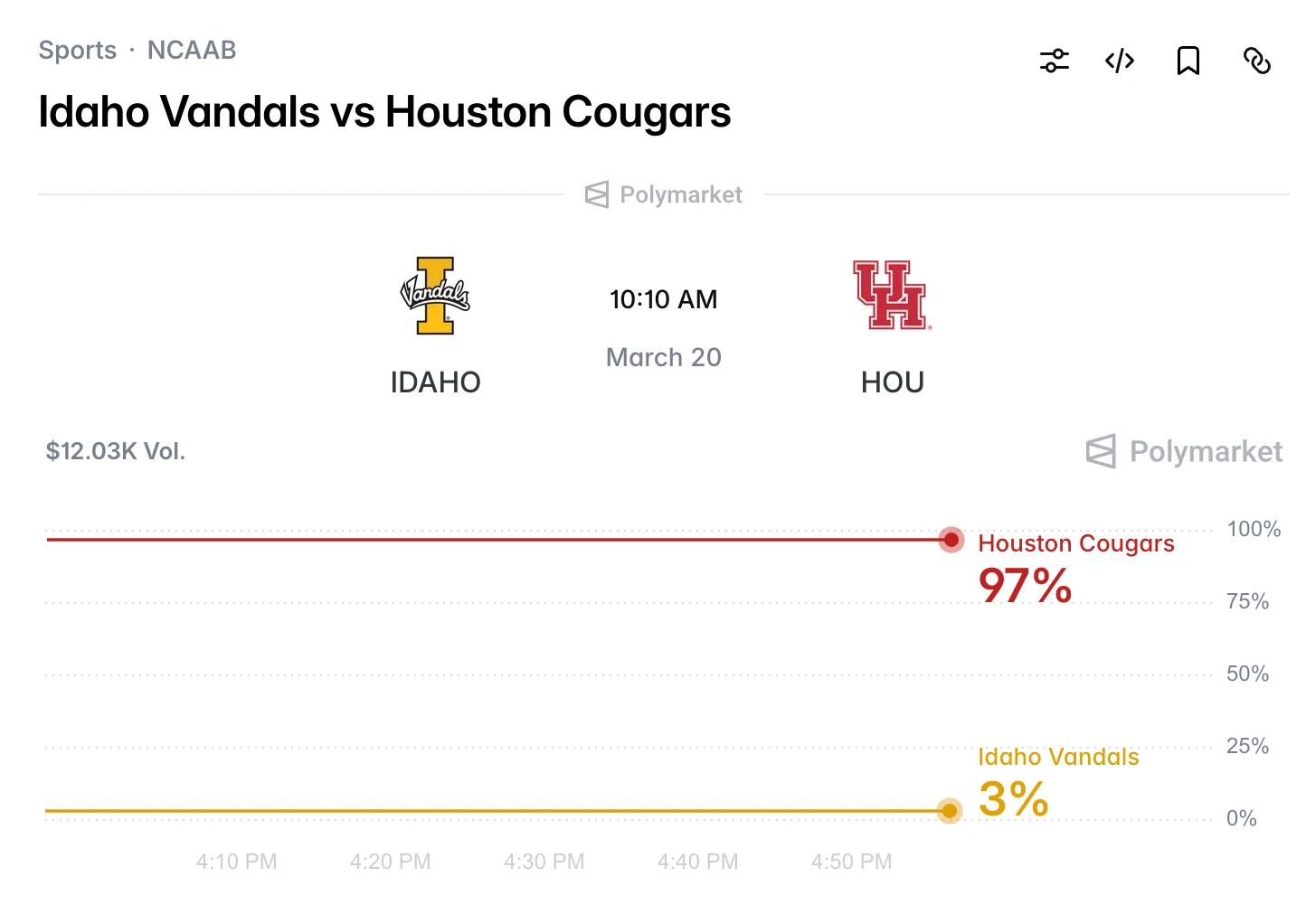 之所以开赛时间越晚越好,是因为 Polymarket 上单场体育赛事的交易流量高峰往往是从比赛开始前不久才会到来,而 Polymarket 现在已开始了补贴投入。还是以后天开赛的这场“爱荷华大学 VS 休斯顿大学”举例,目前的总交易量才 12000 美元,而在一定的流动性基础上,更低的交易量往往意味着更小的波动 —— 下图清晰地展现了 Polymarket 上线这场比赛后的概率波动状况,你没看错,就是一条直线!