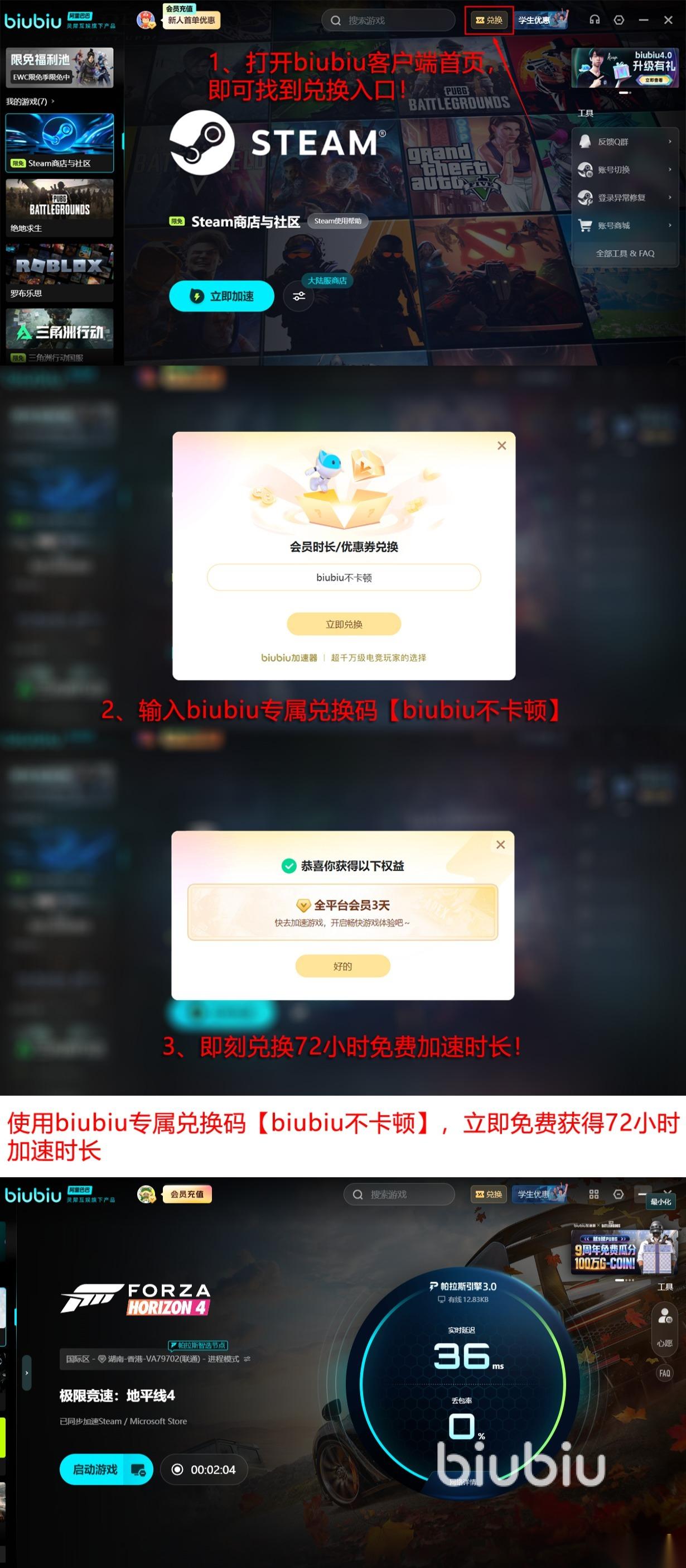 除了专业的技术能力之外,biubiu的活动力度也非常大气。在客户端兑换入口输入【biubiu不卡顿】即可享受整整3天的免费加速服务,新老用户都可参加。如果是新用户则不用着急使用这个兑换口令,因为新注册就会赠送24小时,这个工作日使用就挺好,兑换码留着周末用想想就很香。周六周日正是用网高峰期,这时候才最能体现出biubiu加速器的实力,相信体验过电竞级线路在周末的强劲表现,你也会对biubiu赞赏有加的。