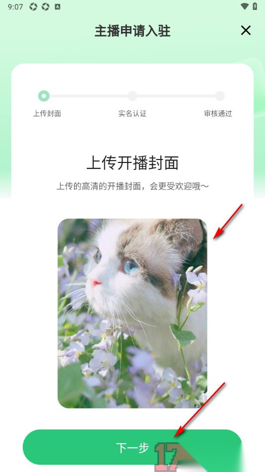 3.在打开的页面上需要从本地相册中上层开播封面,然后点击底部的【下一步】按钮即可进入操作。
