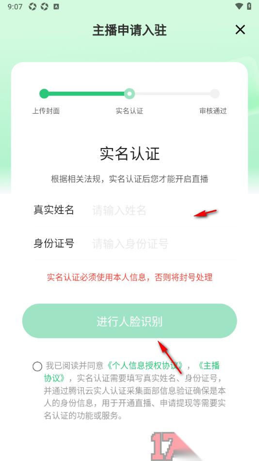 4.在当前打开的页面上需要完成自己的实名认证信息才能进行审核,如果之前已经完成实名认证了这一步就可以省略掉。