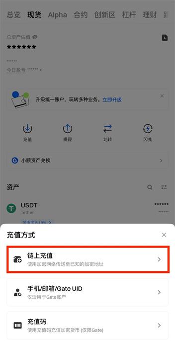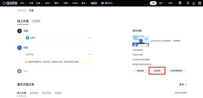 步骤一:登录 Gate 账号,点击“资产”—“资金管理”—“充值-链上” 或直接访问此 充错找回进行处理