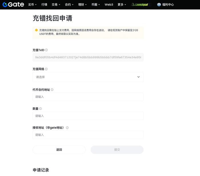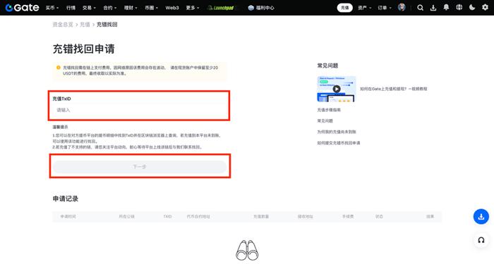 首先登录Gate.io账户,在网页端点击【充值】-【链上充值】,在页面右侧找到并点击【充错找回】直接进入申请页面(App端则点击【充值】-【链上充值】后,点击右上角“?”图标选择【充错找回】)提交申请后预计7个工作日内处理完成,可在申请记录中查看状态,若失败可按提示修改后重新提交。