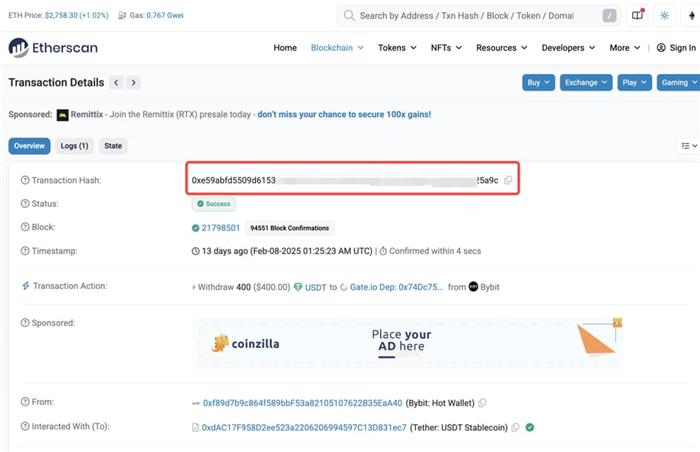 2、您的交易在区块链上的状态为“区块已确认/成功”: