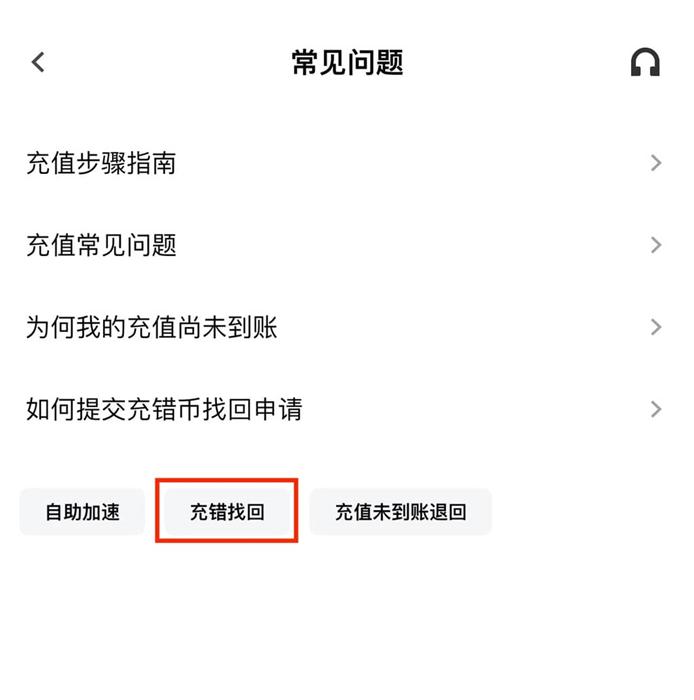 步骤三:点击右上角“问号”的标志,可以进入“常见问题”界面,点击“充错找回”。