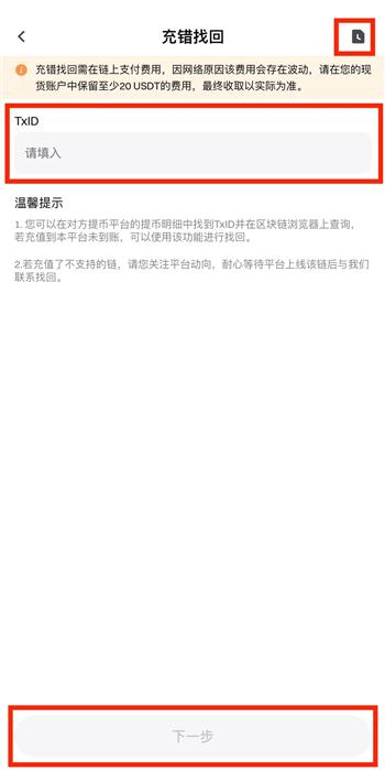 步骤四:进入“充错找回”页面后,填写TxID(哈希值),点击“下一步”。若系统能查询到相关数据,将自动填写部分信息(合约地址、数量、链);接收地址(非 Gate 地址)需用户手动填写。若系统查询到的数据不完整,用户需根据区块信息自行填写。若不支持该 TxID 找回,系统将提示拦截提交操作。