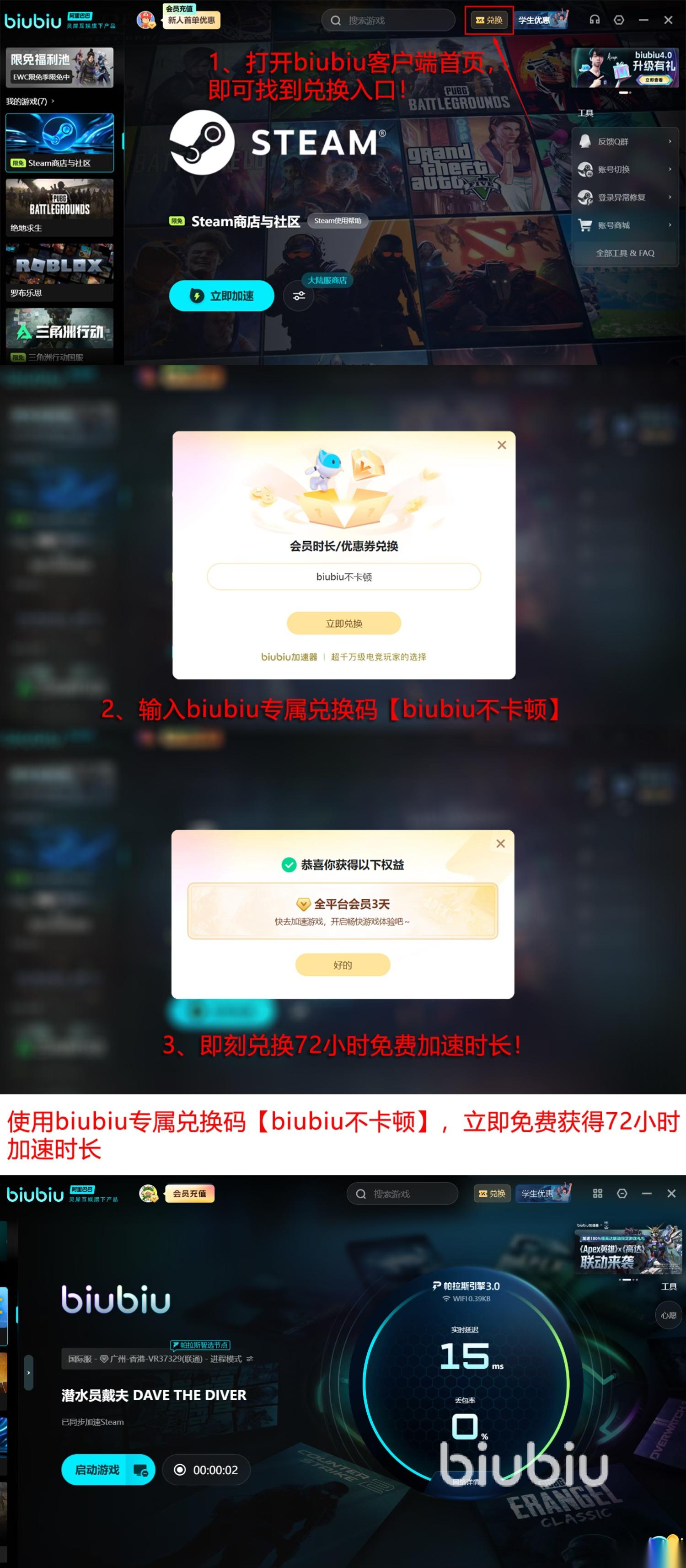 现在新人注册即可直接获赠24免费加速时长;不管是新老用户,只要输入兑换码【biubiu不卡顿】获取3天免费加速特权,让你零氪就能体验到这款海底探险作品,从此告别闪退的烦恼。