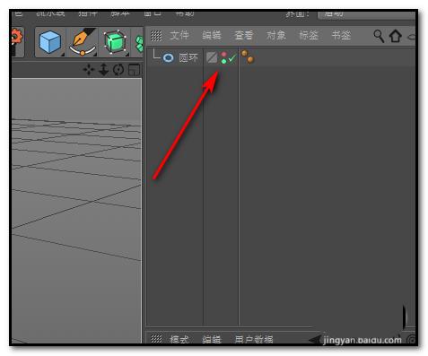 4、当透视视图上的物体不见了,鼠标点下这个红色的圆,即可把物体给呈现显出。此圆点也变回了灰色状态。也就是说,这两个圆可以控制物体的显或隐;我们来看下,当透视视图上的物体正常显示的时候,鼠标点下对象这里的上方这个小圆,点一次,这时,小圆呈绿色状态,透视视图上的物体正常显示。