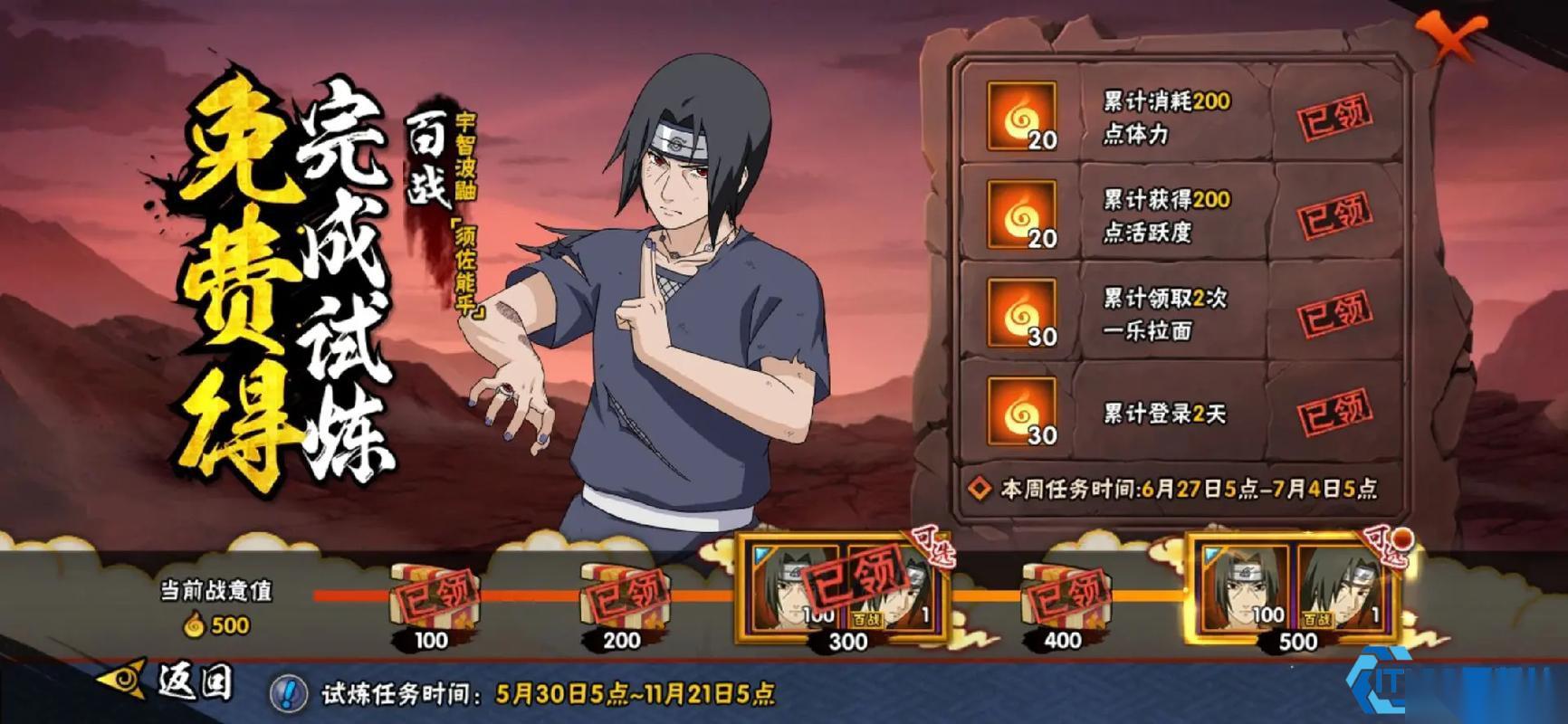 须佐能乎鼬虽已告别常规高级招募的舞台,但这抹暗红色的身影从未真正远离!无数火影迷仍在寻找将这位帅气写轮眼忍者纳入麾下的方式。好消息是,获取他的秘密通道其实相当丰富!