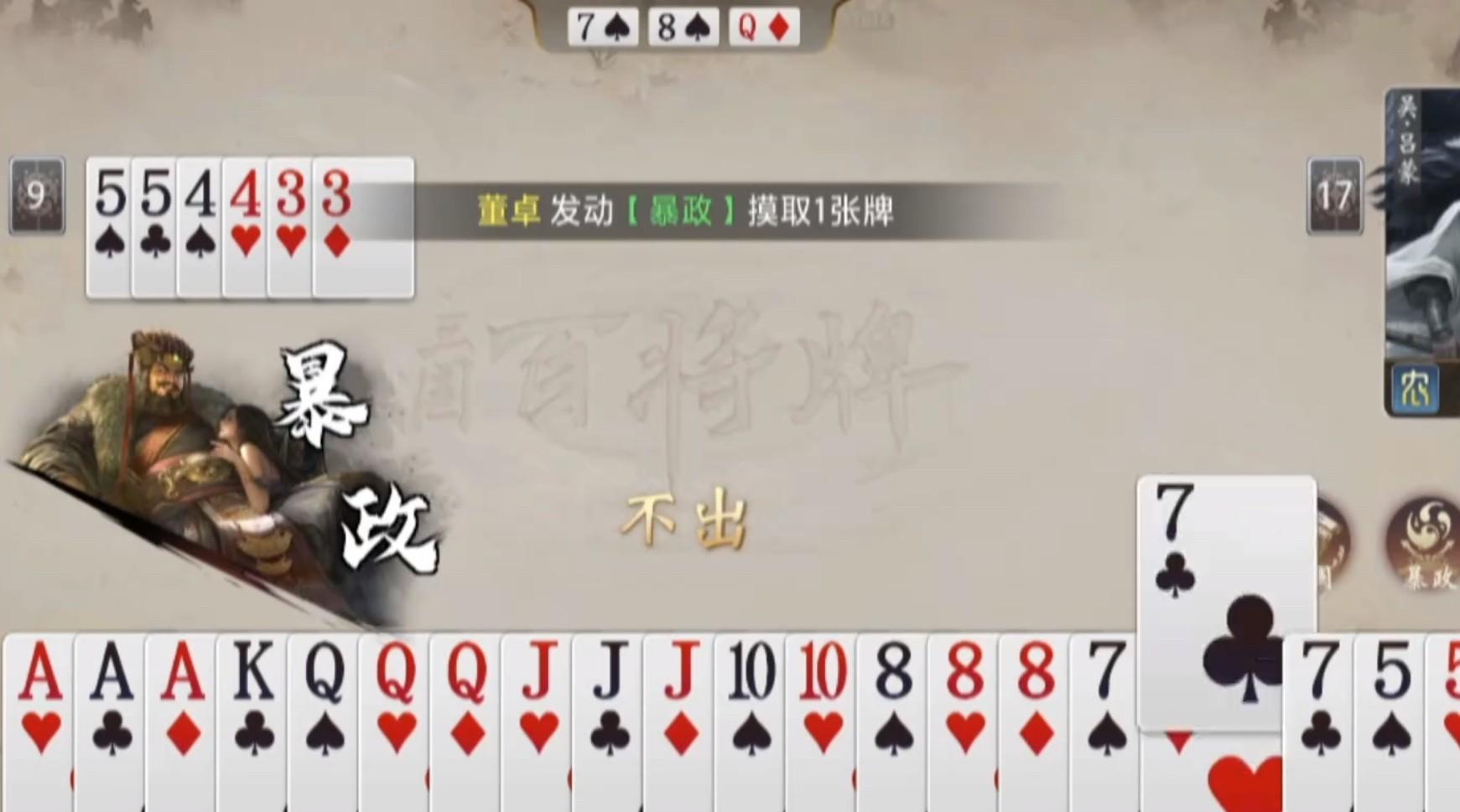 董卓的打法是需要看牌型的,牌型好,打的就快,我们可以利用暴政的第一个效果压牌弃牌快速出掉手里的牌。如果牌不好或者是三带比较多的话,那就可以利用暴政的第二个效果,先囤牌,囤几轮之后凑大牌型,拿下牌局的掌控权。在实战中,如果对手的水平参差不齐的话,大家可以优先选择叫地主,毕竟董卓有优势。但是在三人牌局中,囤牌有一定的局限性,特别是在抢到地主的情况下,如果选择囤牌流的话那就一定要掌握好牌型和时机,否则很容易翻车。