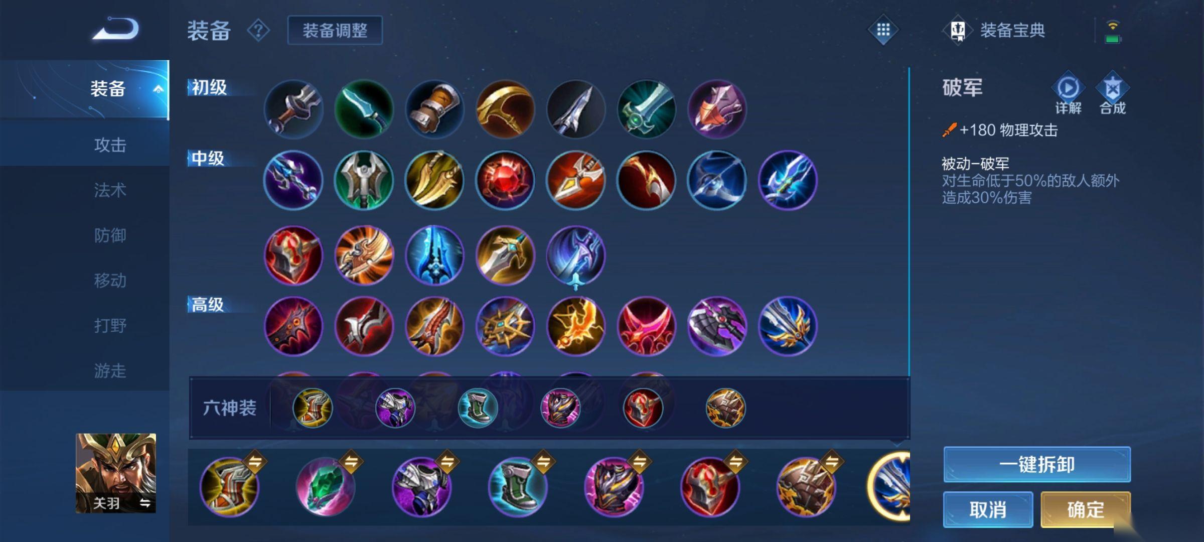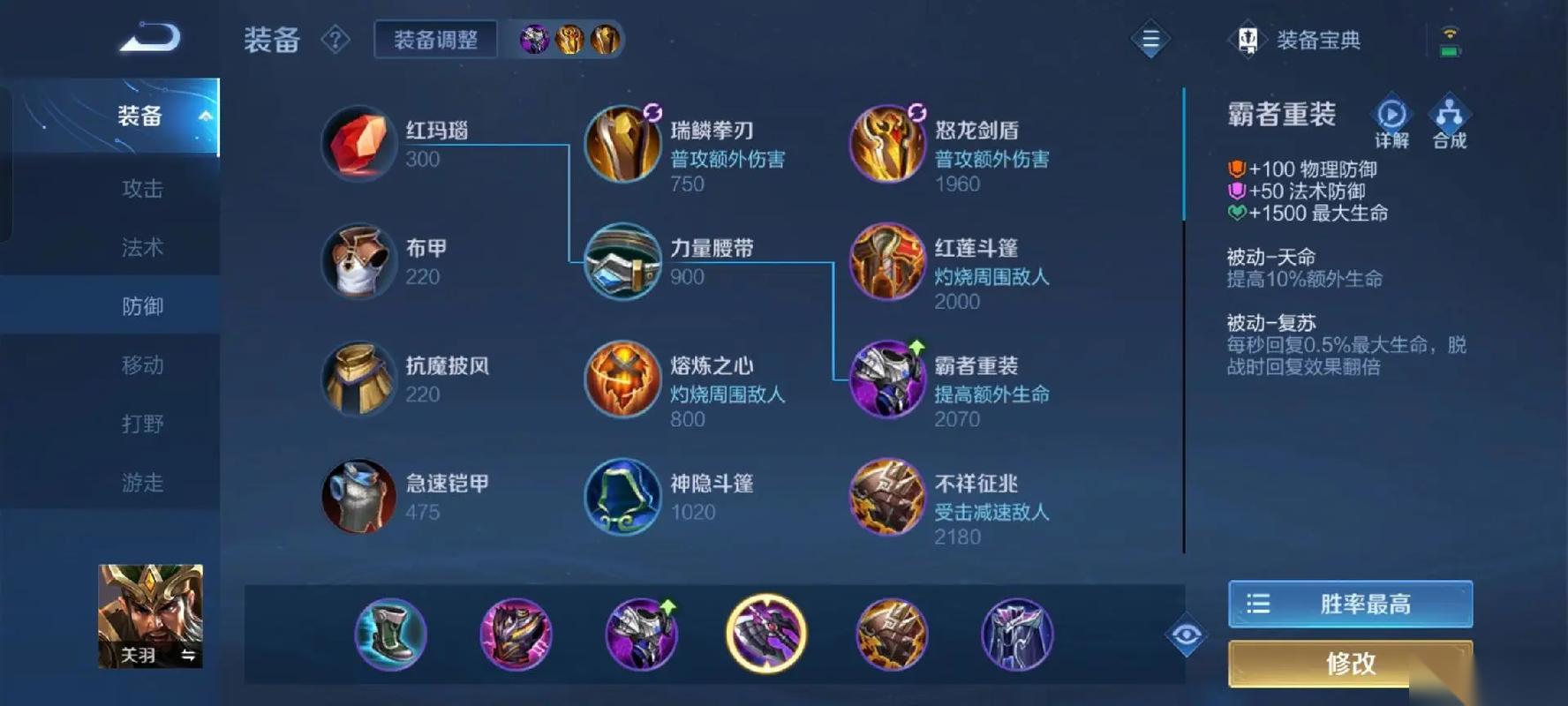 关羽的战力发挥围绕冲锋姿态的机制展开,所以出装思路就是降低被控概率。如果是普通玩家,优先选择容错率最高的半肉出装即可。开局先出抵抗之靴,避免冲锋姿态被轻易打断。第二件补暗影战斧,既能加快前期清线效率,打脆皮英雄也能有足够的伤害。后续依次补上暴烈之甲、不祥征兆、魔女斗篷,最后一件补碎星锤。暴烈之甲的受击增速增伤效果完美适配关羽冲阵的特性,不祥征兆和魔女斗篷分别针对敌方物理和法术输出。