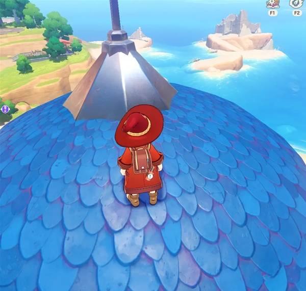 看过纸条后,站在可可果之王上,往旁边看,能在某个角度看到一个蓝色带旗帜的尖顶,那就是下一步的地点。