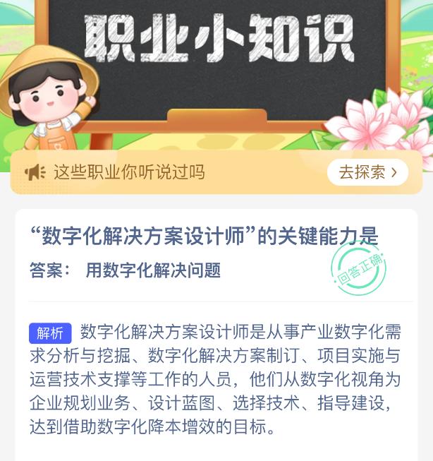 “数字化解决方案设计师”的关键能力是?【蚂蚁新村每日一题】2026年3月30日题目新鲜上线啦!今日答案是:【用数字化解决问题】。每日坚持答题,不仅能积累木兰币为小镇建设添砖加瓦,更有惊喜奖励等你来拿。只要答对今日题目,即可立即享受“产速+3/时”的加速福利,让你建设小镇的步伐更快一步。