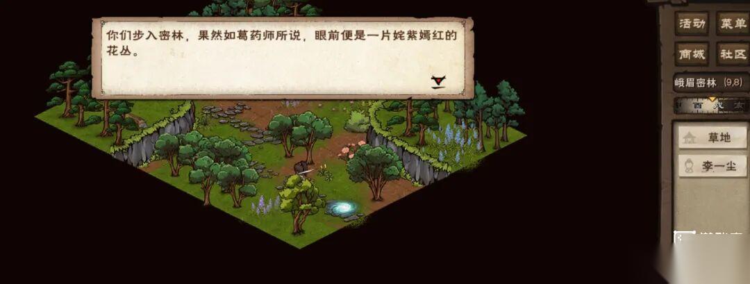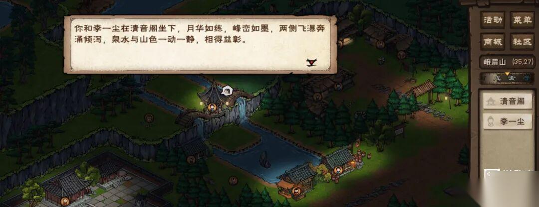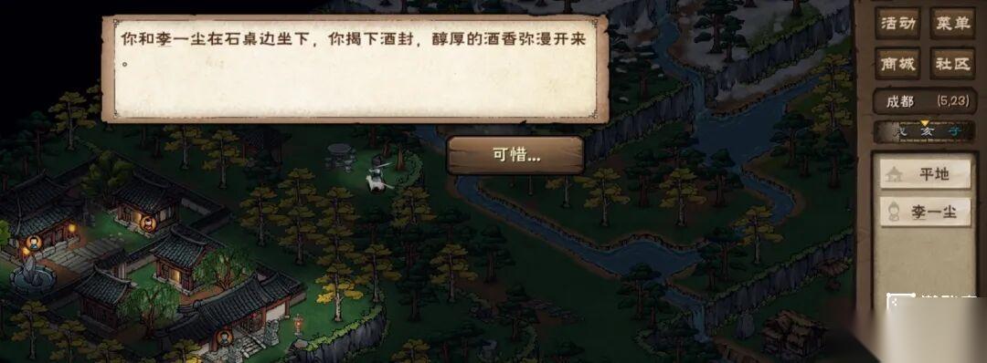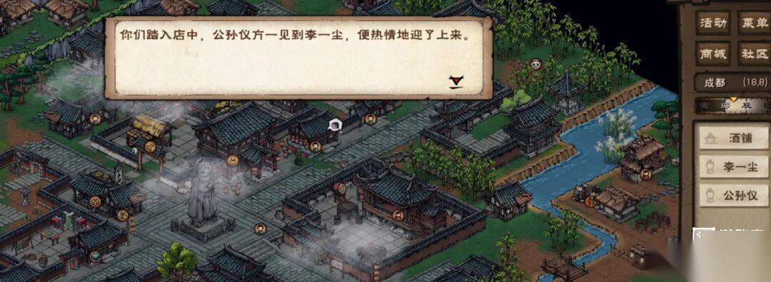 1.拥有随从「李一尘」,随处走走概率触发剧情,去(30,8)对话游商,选择「我来买吧」可增加好感,然后去(27,8)对话李一尘。