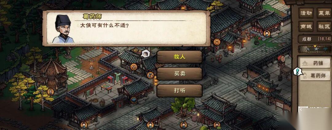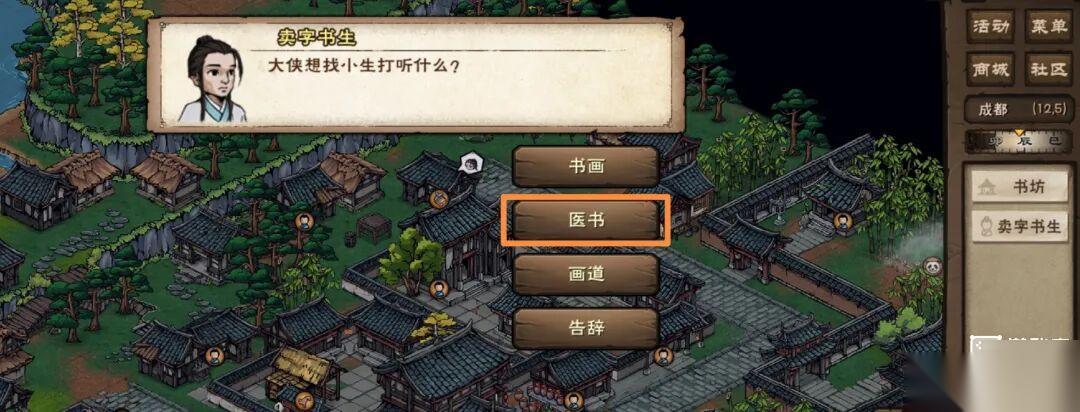 3.向卖书先生(12,5)打听「医书」,剧情后选择「药师」,再向葛药师(16,14)打听「五色梅」。