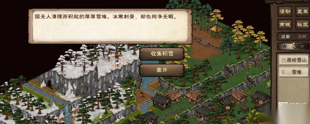 6.在(2,8)雪堆处「收集积雪」后获得「高山雪水」,然后在(18,8)对话李一尘。
