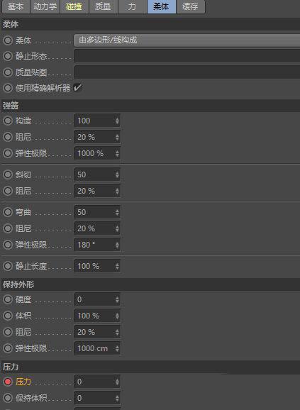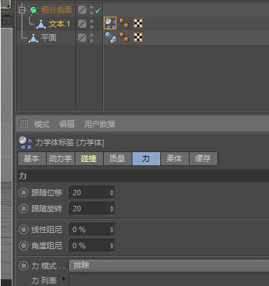 接下来进入“柔体”选项,设置他的值,将“跟随位移”和“跟随选转”的值改为“20”,这里按自己的实际情况来调整,