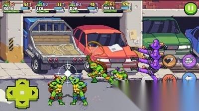 《忍者神龟施莱德的复仇》分别围绕着老鼠师傅被绑架以及反派施莱德,游戏进行了双故事线模式的设计,而且在走剧情进行关卡战斗的同时,游戏会把核心的情节以反派进行对话的形式向我们讲解,4个忍者龟,4种特性分明的外貌以及技能特征打造,关关我们都要迎战三个阶段的敌人出场。