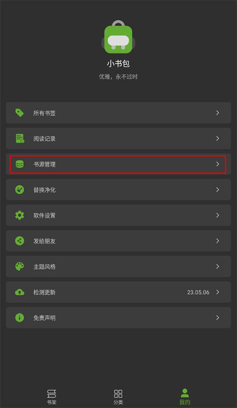小书包app怎么找书源,该应用的书源是内置的,无需另外再输入书源地址进行查找,在“我的-书源管理”可以看到有超多小说书源,再也不怕找不到你想看的小说啦。