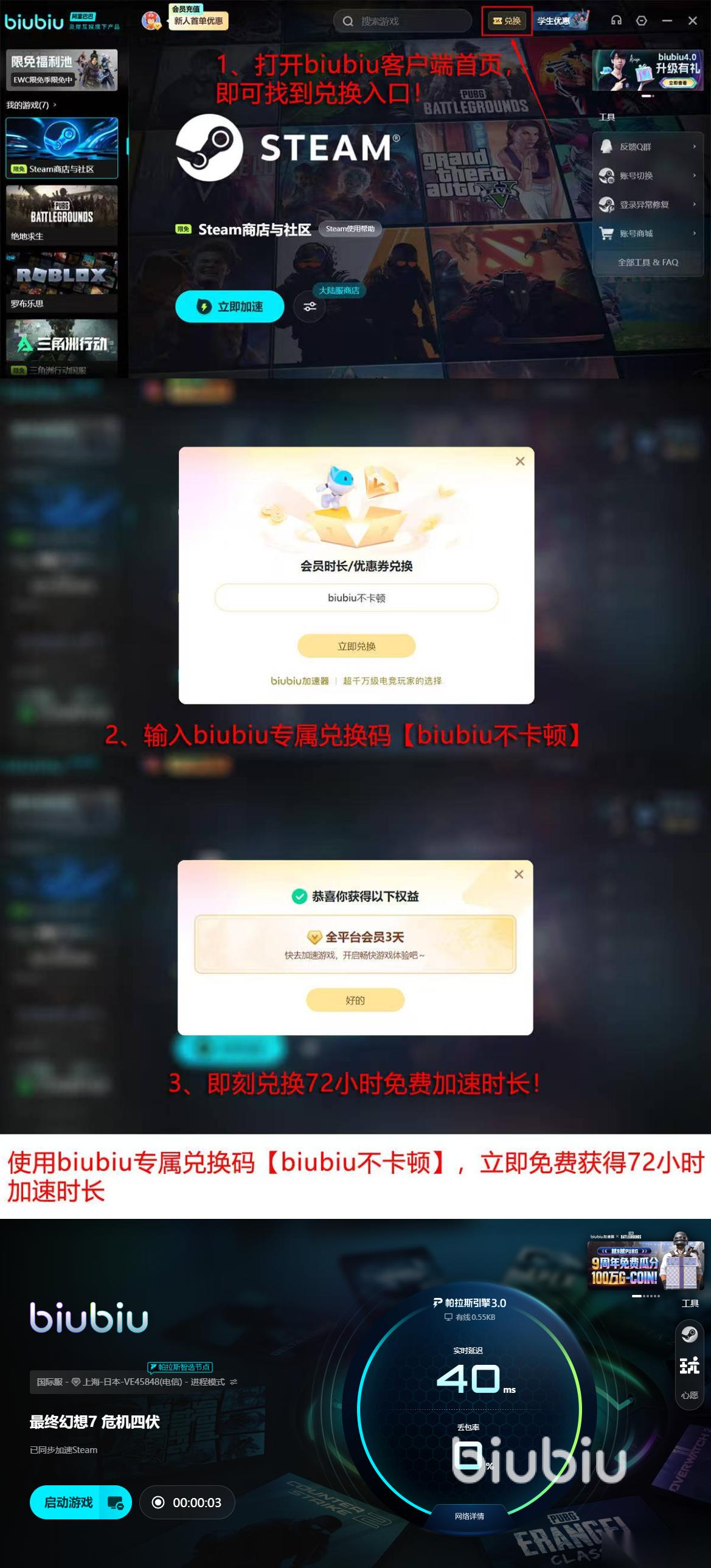 当然啦,好东西也要让大家先用上才知道好不好。biubiu对新老朋友都非常友好,新人刚注册的时候,直接就能白嫖24小时的免费加速时长。这还不算完,不管是刚来的新玩家还是已经用过的老用户,只要在兑换码的位置输入【biubiu不卡顿】,就能再领3天也就是72小时的免费加速。这两个福利加起来,等于有整整四天的时间随便用,足够小伙伴们好好体验一把丝滑不卡顿的《最终幻想7重生》了。