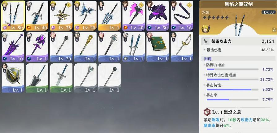 第一个就是黑焰套装,黑焰套装在武器效果上面为大家带来的攻击力提升有很多的提升空间,也是目前自选里面最多玩家会用的,在这里他以特定武器效果带来能力的时候,大家可以用的是黑焰之翼,上面在攻击力单独效果上面都可以位列到S级,这类自选武器的效果可以为大家带来的触发能力当中带来的是爆发攻击,在攻击能力上面可以触发24%的输出提升,另外在暴击概率上面可以提升额外20%的效果,另外他这样的输出提升会持续20秒的时间,所以此类攻击能力是具有激进效果的,特别是如果大家用爆发能力比较高的角色搭配这类黑焰套装的话,在其中拥有的被动绝对是可以触发更多的增益,也会让角色的潜力效果出得到最大的增强。