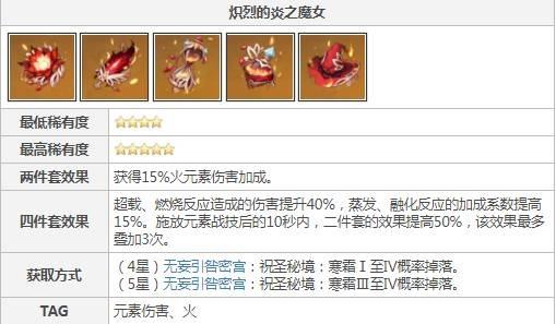 推荐理由:四件套增强火元素造成的元素伤害和反应伤害。元素反应相比物理或是干喷火有着更高的伤害上限,并且香菱的突破属性为元素精通天生适合打反应,而魔女四件套可以进一步提高香菱通过反应所造成的伤害。