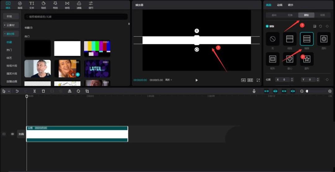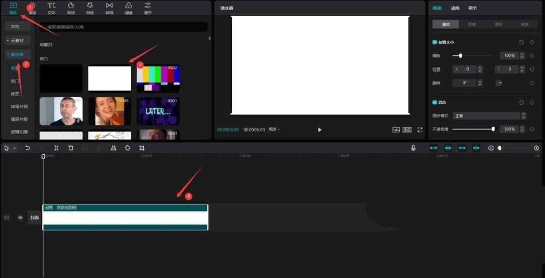 点击媒体按钮,然后点击素材库按钮,选择白场素材,将其添加到视频轨道中,见下图。