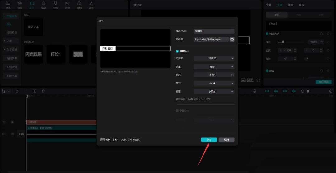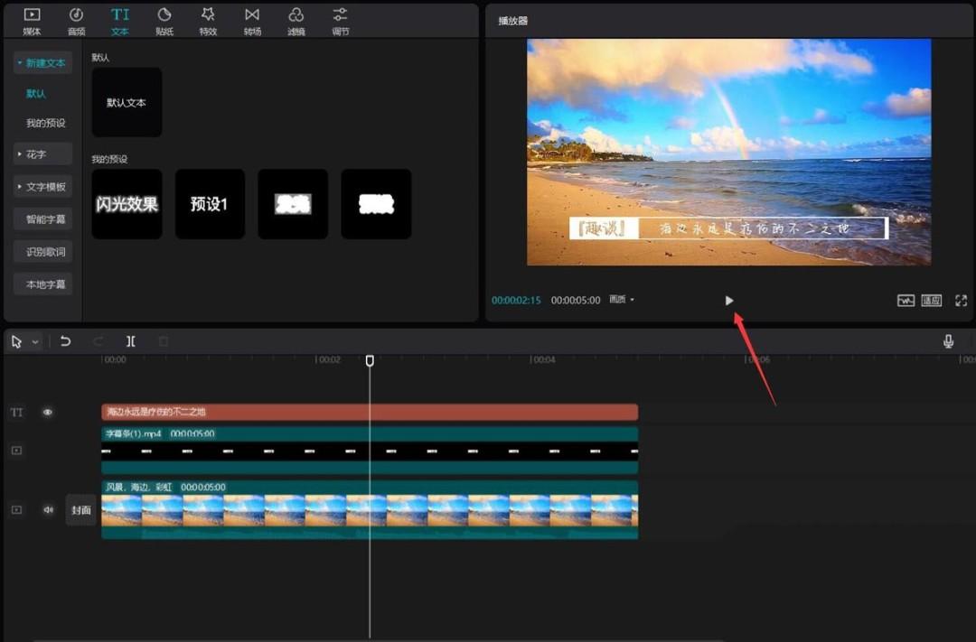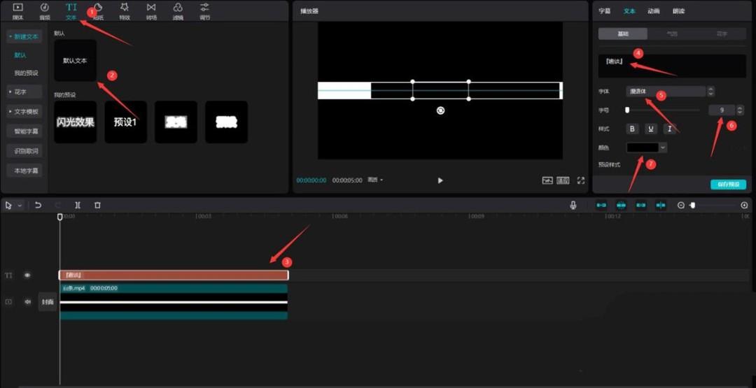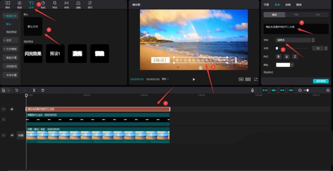 点击文本按钮,选择默认文本,将其添加到文本轨道中,更改文本内容为你想展示的内容,字体选择你喜欢的,然后将文本移动到字幕条中,见下图。