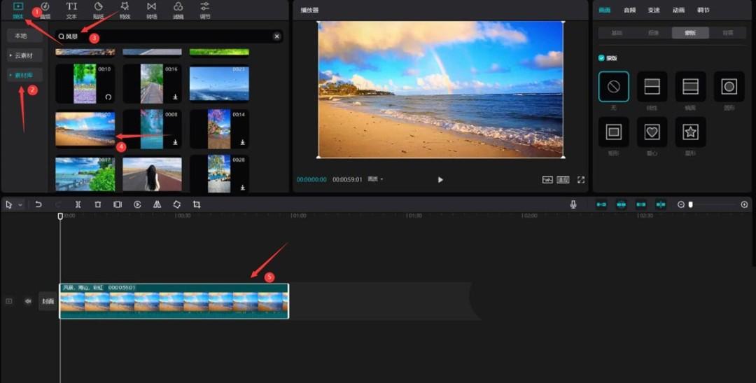 点击媒体按钮,然后点击素材库按钮,在搜索栏中输入风景两字,选择一段视频素材,将其添加到视频轨道中,见下图。
