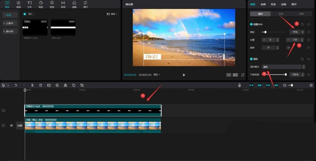 导入刚才导出的视频,将其添加到视频轨道中,更改缩放为79%,Y为-725,混合模式为滤色,见下图。