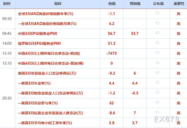 市场同时关注周五美国非农就业报告,预计3月新增就业岗位6万个。