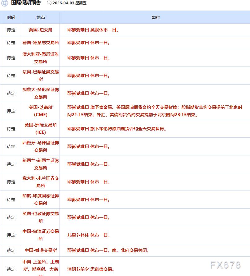 周五(东八区4月3日)亚市早盘,因耶稣受难日,黄金原油日内全天交易暂停,但周四金价下挫,最终收于4700美元/盎司下方,受美元走强及加息预期升温影响;油价周四大涨超13%,美原油站上112美元/桶,创下2020年以来最大单日绝对值涨幅,因美国总统特朗普誓言将继续打击伊朗、且未给出结束敌对行动或重新开放霍尔木兹海峡的时间表影响。
