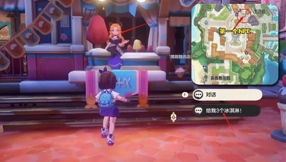 找到脆筒甜甜店的NPC并对话,领取3个冰激凌;