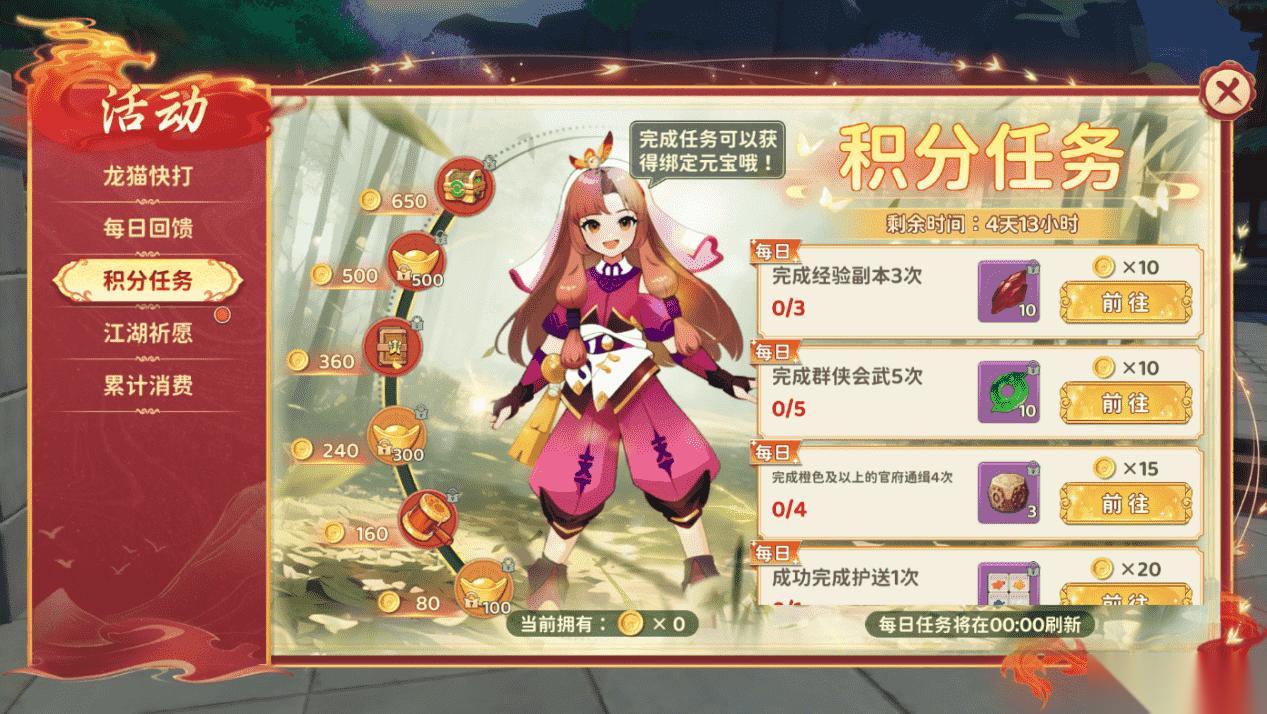 完成每日任务,轻松赢取丰厚积分,绑定元宝与珍稀道具等你拿!任务简单易行,奖励超值丰厚,每日惊喜不断,助力快速成长!