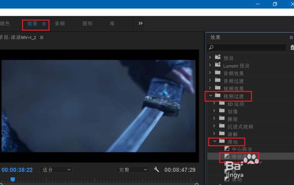 5、然后点击上方的效果,在右侧找到视频过渡,滑动,带状滑动命令。