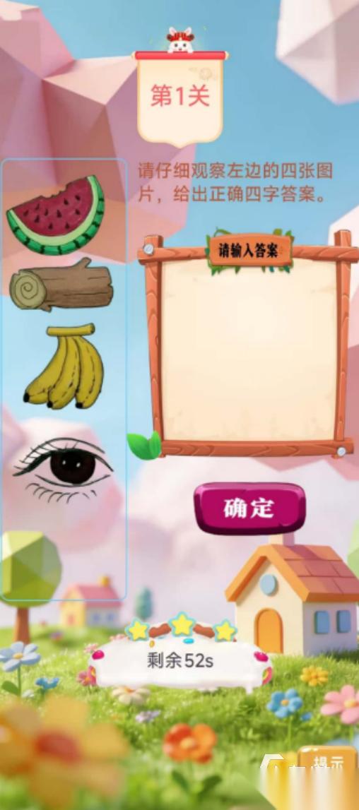 在主页面中将会看到不同的模式,就比如有看图闯关,或者是从超简单再到中等难度的模式中,任由大家来挑选,开局之后屏幕最左侧将会看到一些栩栩如生的图片,就比如有香蕉或者是西瓜等等,而大家却需要按照这些图片给出的寓意,猜出正确的答案,只要回答正确之后就能够完成挑战。