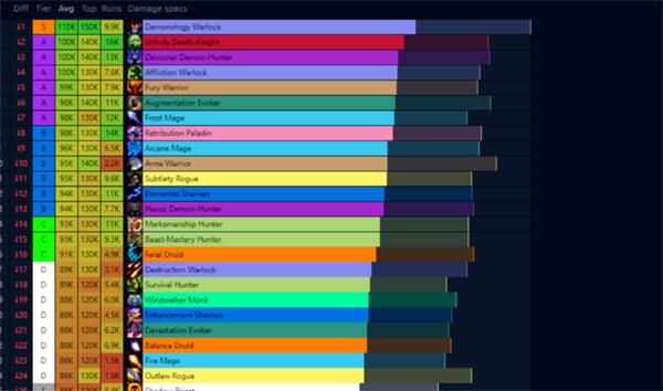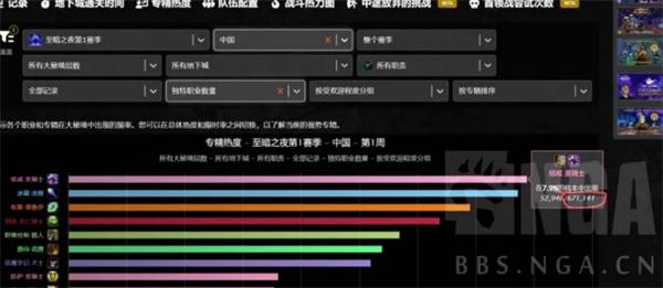 欧服限时率也最高(90.6%),美服限时率(89.4%)。国服的限时率(85.1%)相对最低,超时记录占比明显高于其他两区。而在这里面使用得最多的两个专精分别是惩戒骑和冰法,其中使用惩戒骑的人数高达67万,冰法以63万的成绩紧随其后。这两个职业在当前的全职业强度排名中,算不上很强,冰法勉强算A级,惩戒骑则是连A级都不算只有B级的强度,那么为什么那么多玩家选择呢?