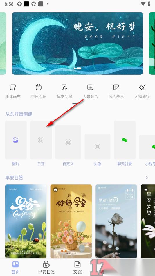 1.在手机上找到早安心语APP这款软件点击打开,在打开的页面上选择自己想要设置的海报类型,将其点击打开即可进入。