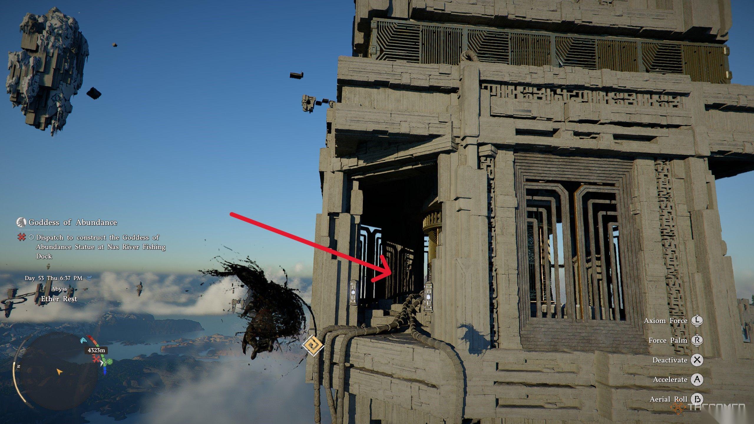 继续向上攀登塔楼,直到到达一个拥有数个风扇和一个漂浮深渊核心的房间。拿起深渊核心,带着它前往这个房间顶部的开口。将深渊核心放在基座上(上面有一个漂浮的立方体),然后沿着缆线走到建筑物的顶部。现在使用大型风扇滑翔过间隙,降落在对面岛屿的圆形开关上。