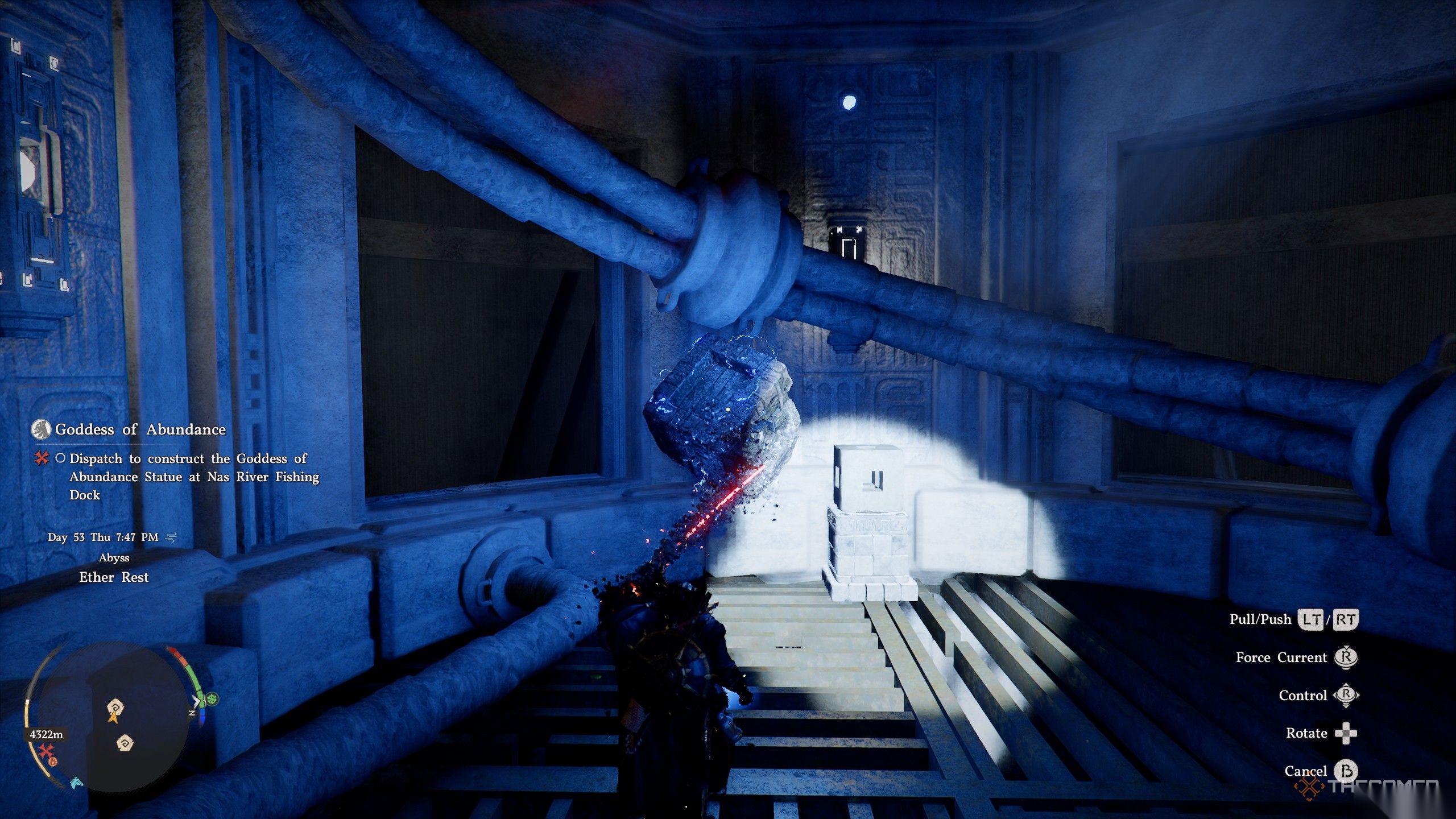 最后,将光束立方体放回你在谜题开始时找到它的初始基座上,乘坐移动平台到达尽头,并将长方形的深渊核心插入其插槽以激活一个传送器。乘坐传送器上到上面的房间,用力之掌击打地板上的大开关,并收集你的深渊神器以完成这个谜题。