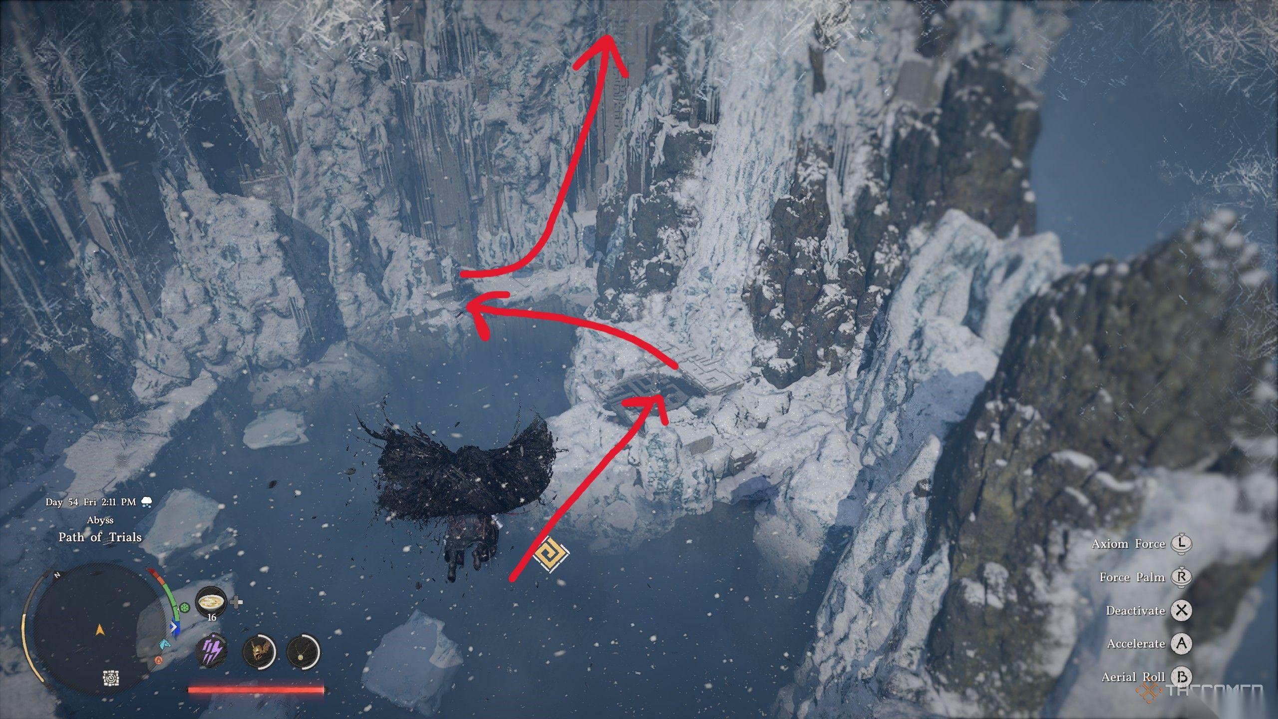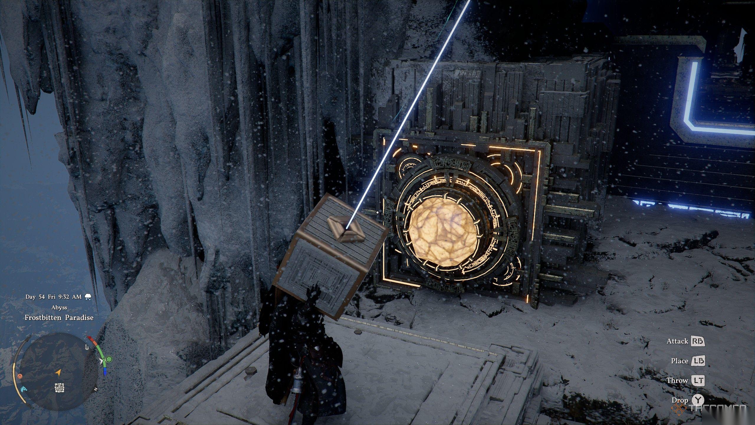 你需要快速移动,因为深渊核心会冻结,但一旦就位,只需用力之掌将其砸入。现在爬到你砸入深渊核心位置的上方,对圆形开关施展力之掌以完成谜题。收集此开关上方的深渊神器,不仅可以获得一个免费技能点,最终还能解锁寒霜元素。