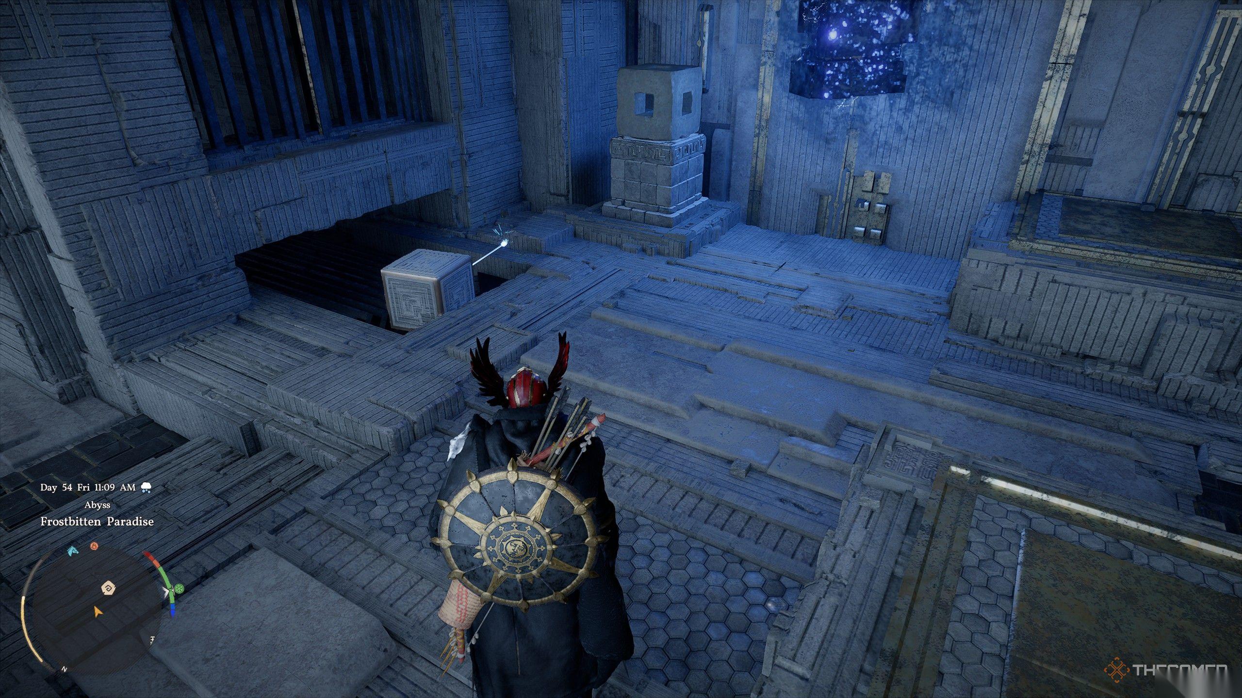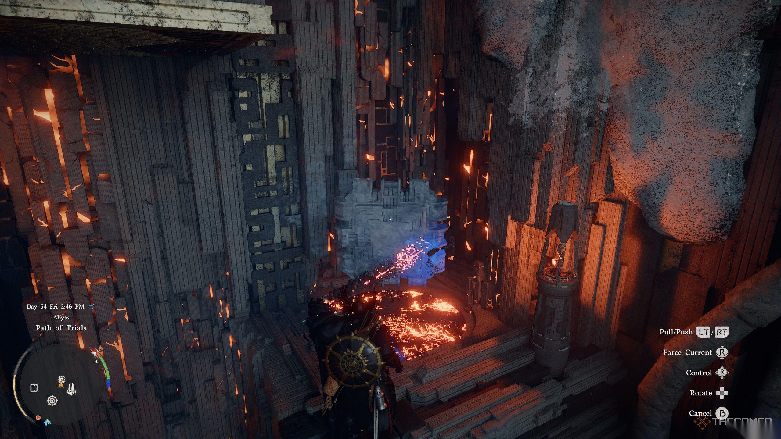 爬上熔炉房的墙壁,沿着路径前进,直到你看到一个地面上的方形深渊核心插槽以及旁边冻结的深渊核心。拿起深渊核心,将其带回熔炉,以便你可以将其浸入角落的熔岩池中。将核心留在熔岩中直到所有冰融化,然后迅速将其带回它原先所在的插槽旁边。