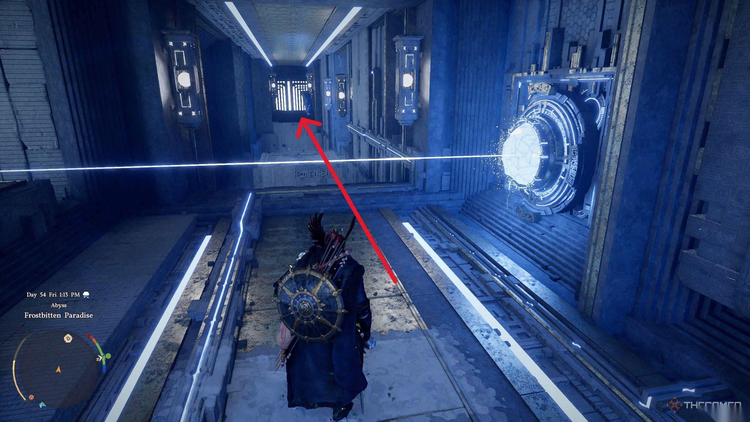 一旦开关被激活,屏障就会降下,你可以进入一条长长的走廊。进入走廊后,直接踩在你左边的方形压力板上。这将移动大厅中央的地板,露出另一条你可以跳下去的走廊。跳下走廊,拿起长方形的深渊核心,并将其插入屏障旁边的插槽中。