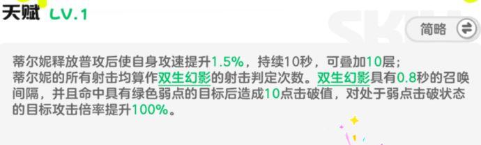 基于这个思路,同样擅长高攻速的蒂尔妮无疑是丹塔莉的上位替代,其天赋在提供高额攻速的同时,还能对具有绿色弱点的目标输出大量的击破值,并获得击破增伤。
