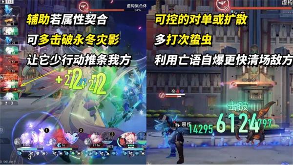 第1波,对单或扩散伤害型技能集火次蛰虫,利用它的亡语自爆群伤更快度过第1波。辅助角色若为“物火量子”,可优先击破永冬灾影推条,尽量降低它行动频次,减少命中推条的影响;