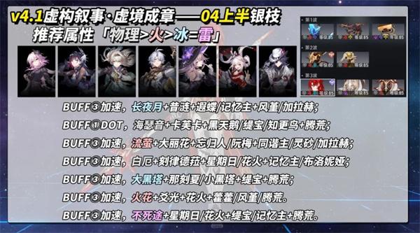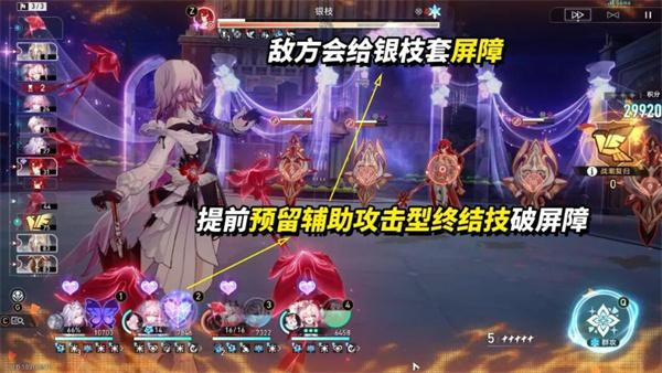 第3波,重点关注银枝状态,对局中「盾」行动时会给银枝套1层抵消伤害的屏障,建议队伍内至少有1位进攻性终结技的辅助或副C,在主C行动前破除银枝身上的屏障,避免伤害抵消。