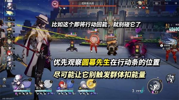 第1波,观察行动条将行动的“惊梦剧团圆幕先生”当前状态,主动控制我方行动攻击目标,尽可能让对方别触发群体扣能量。至于破除自动机兵甲虫的屏障,优先级后置;