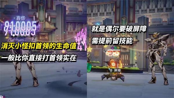 第3波,萨姆生命值太高,优先击杀小怪扣血。观察行动条自动机兵甲虫的位置,辅助/副C角色提前留进攻型终结技,确保主C输出不被屏障抵消。